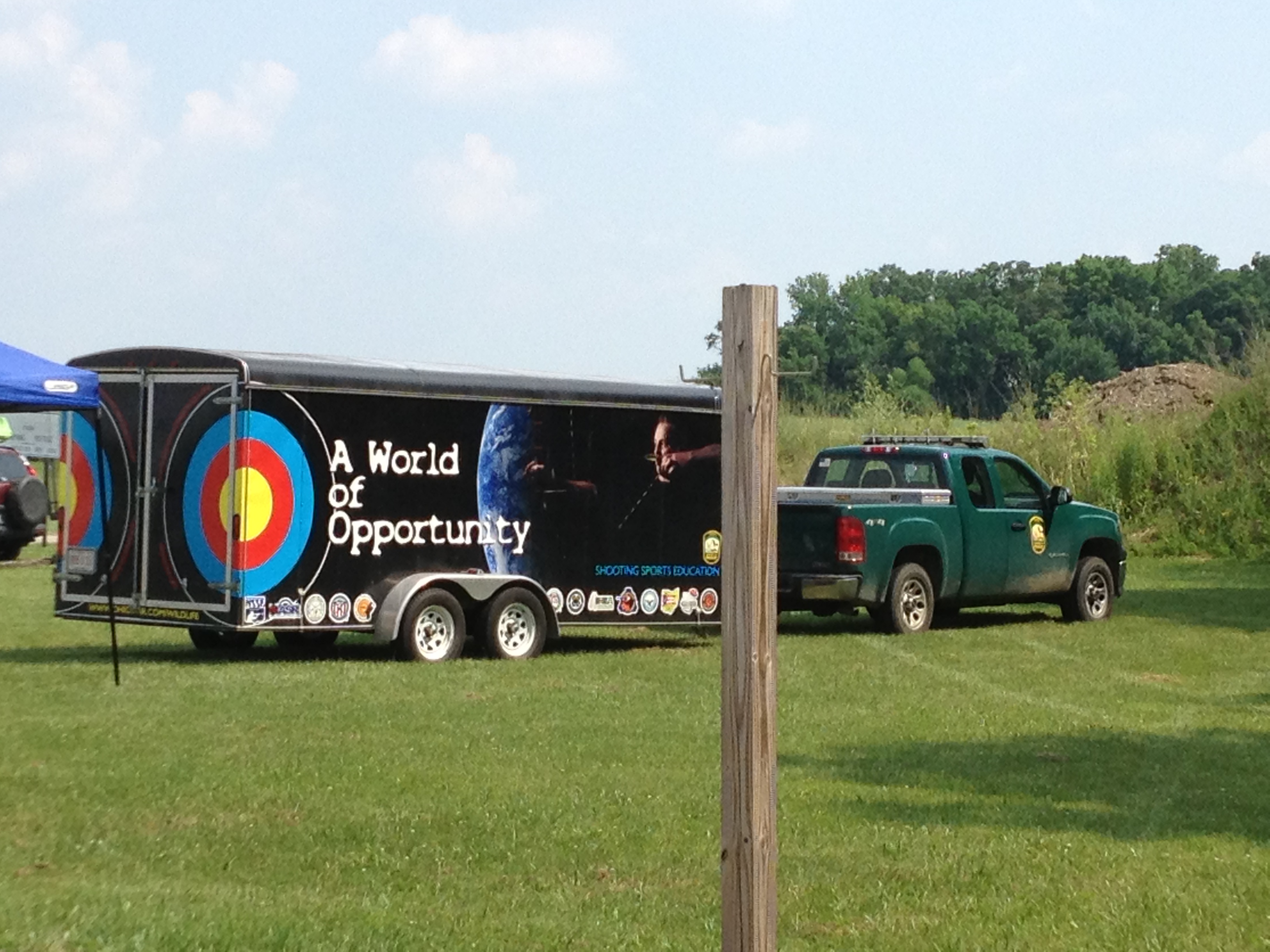 2013-06-22 16.07.26Our last stop of the day was the archery trailer. Here an Ohio Wildlife Officer helped us determine our dominant eye, how to hold the bow and load the arrow. Everyone got a turn at shooting at the targets set up in a long trailer. My sister volunteered to go first and did quite well. I went next, and while I won’t ever compete with Katniss Everdeen, I at least hit the target and hit my balloon on the first try (although it wasn’t a competition). We had a good time chatting with our instructors (one who was a bigfoot believer, the other not so much) as each of the gals took their turn shooting the bow. We felt bad for the Wildlife Officer who unlike the Watercraft Officers wasn’t able to wear shorts. We suggested he petition to have the uniform policy modified. We also asked questions and learned about tasers (which he doesn’t carry) and some of the various equipment on his belt including his handcuffs and five flashlights. Yes, flashlights plural. It was this piece of knowledge that I took for the title of this post. You see, when I asked why he needed so many flashlights, he said that when you are on a call in the middle of the woods at 2:00 AM the last thing you want is for your flashlight to die – thus, “One is none, two is one and five is better.” Good point, I thought. And he was the one who didn’t believe in bigfoot:) I think he was happy when our session came to an end!