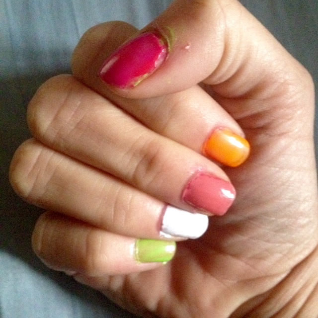 The next two days, I “Dayquilled” and chicken-souped my way through work.  Today, while I still have a bit of a stuffy nose and a cough, I feel 100 times better than I did Sunday. I glance down as my rainbow-colored nails tap on the keyboard and smile to myself. (I’ll take it off tomorrow.) Somehow, I think, getting a make over and a little love can make you feel just a bit better no matter how bad you feel inside. So maybe tonight, we’ll go out for a special treat…unless the scratchy throat has moved on to one of them, in which case, I’ll do their nails:)