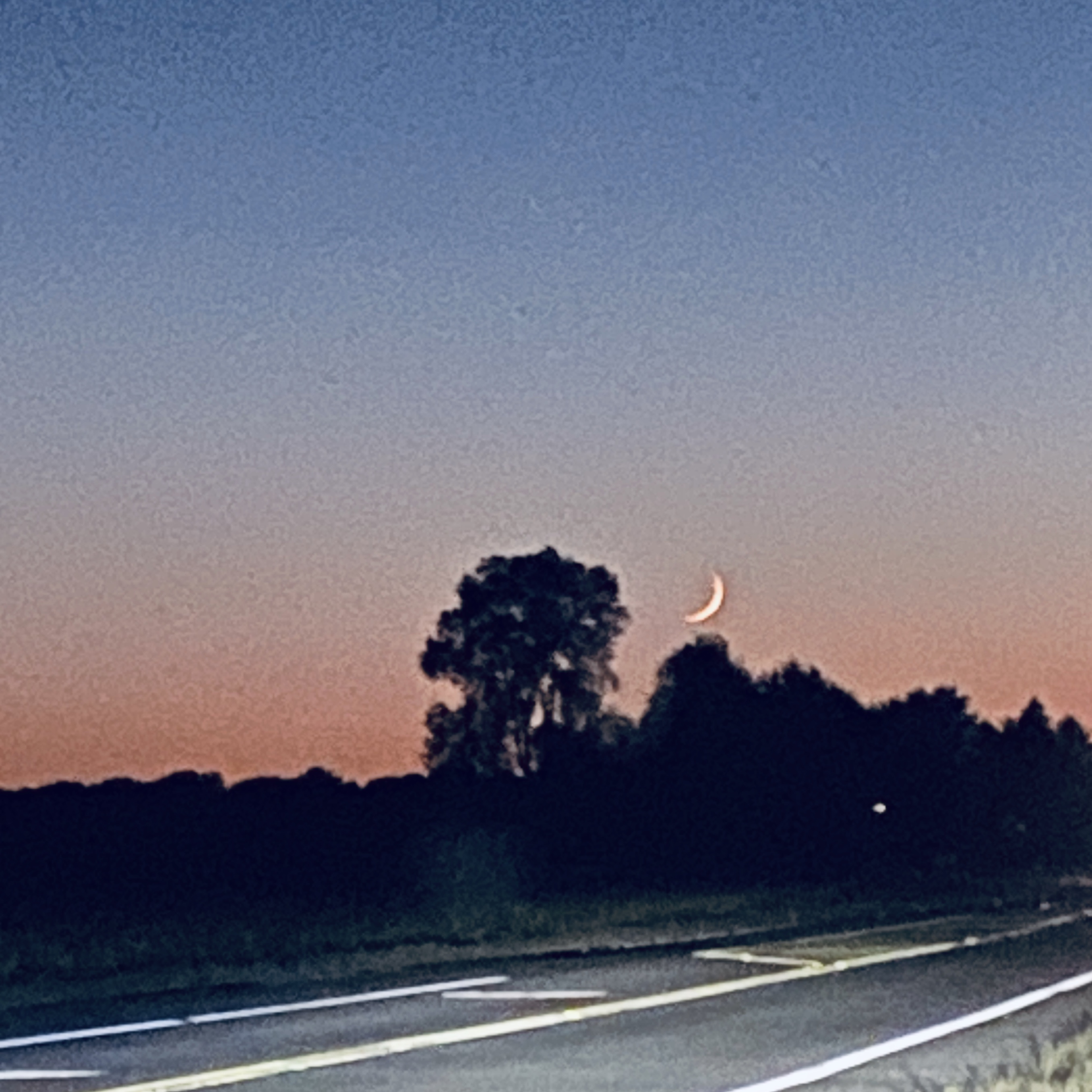 - As I drove home Friday evening, I pulled over in a safe place along Route 6 and rolled the window down. I felt the cool breeze on my face and enjoyed the beauty of the sky. The moon was a tiny yellow sliver in the darkening sky still painted in the pinks and oranges of the sunset. I could just make out the outline of the rest of the moon against that awe-inspiring backdrop. Of course, I tried to take a photo or two (my real reason for pulling over as driving and taking photos wouldn’t have been smart).